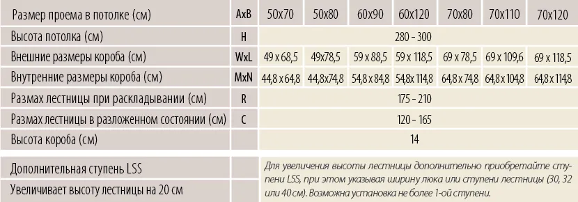Благодаря «ножничной» системе складывания в сложенном виде лестница LSF очень компактна, и соответственно имеет небольшой размер крышки люка. Специальный механизм регулировки угла открывания крышки люка позволяет подогнать высоту лестницы под высоту потолка.