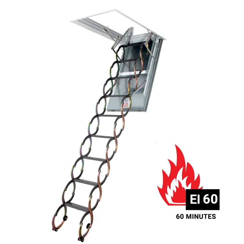Модель обладает высокими показателями огнестойкости (60 мин.) По периметру крышки люка, изготовленного из огнеупорного несгораемого материала, установлен контур уплотнения, который, расширяясь под влиянием высокой температуры, ограничивает проникновение дыма. Все материалы, используемые при производстве лестницы, прошли испытания на огнестойкость и соответствуют всем европейским нормам и имеют необходимые российские пожарные сертификаты соответствия.