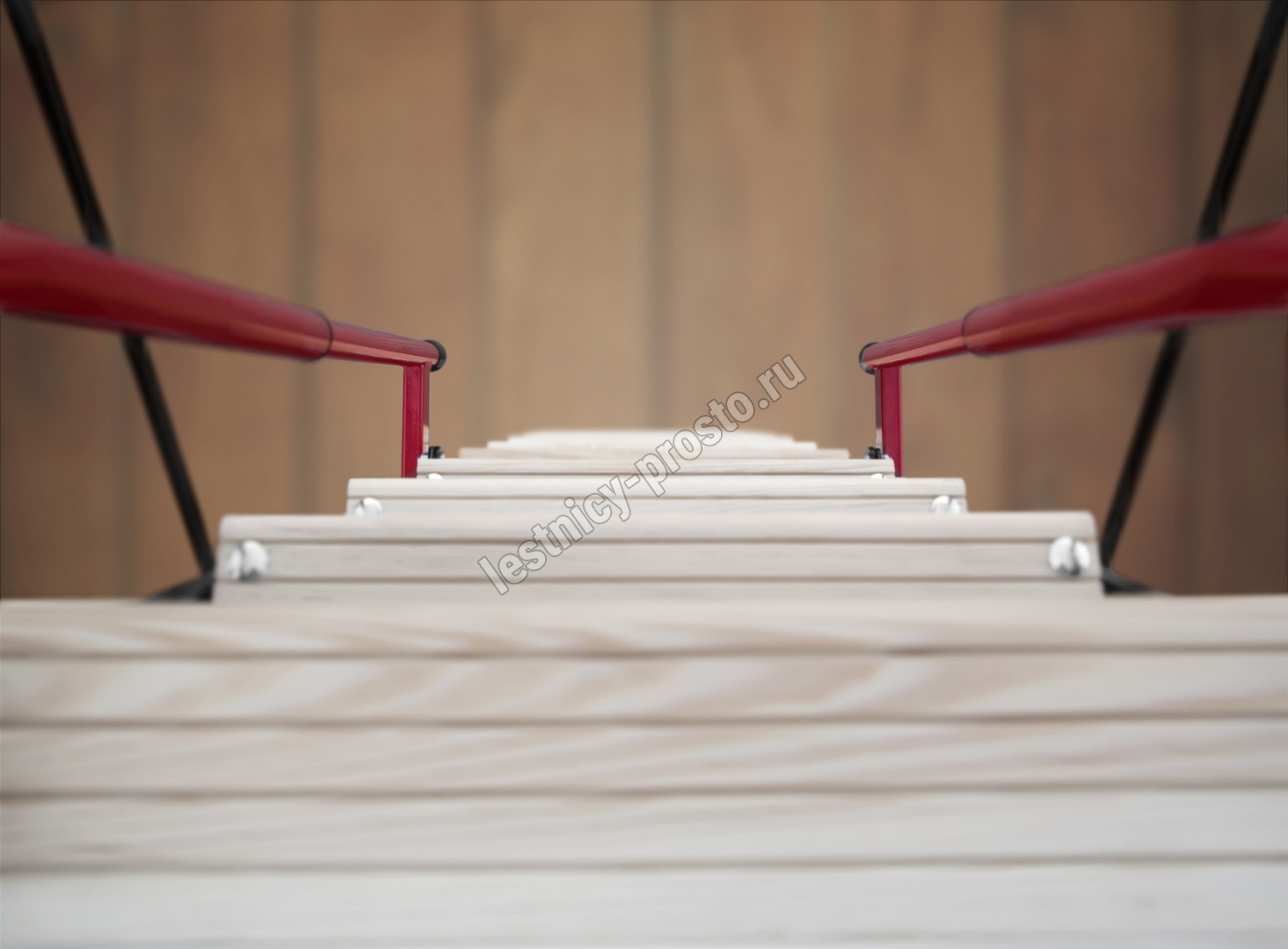 Лестница чердачная, складная, комбинированная 3-х секционная, металлические направляющие/деревянные ступени. Короб люка имеет двухточечную систему запирания. Телескопический поручень имеет внутреннюю пружину и при складывании лестницы служит механическим приводом, что облегчает процесс. Делает его полуавтоматическим. Оборудована дополнительной ступенькой на люке помогающей комфортно подниматься и спускаться. Термоизоляционная крышка типа "сэндвич", толщиной 86мм, утеплена пенопластом, облицована с двух сторон ДВП белого цвета. Лестница подходит для установки в местах с большими перепадами температур. Короб деревянный, высотой 170мм., по периметру проходит уплотнитель. Лестница выпускается для немецкого и английского рынка.