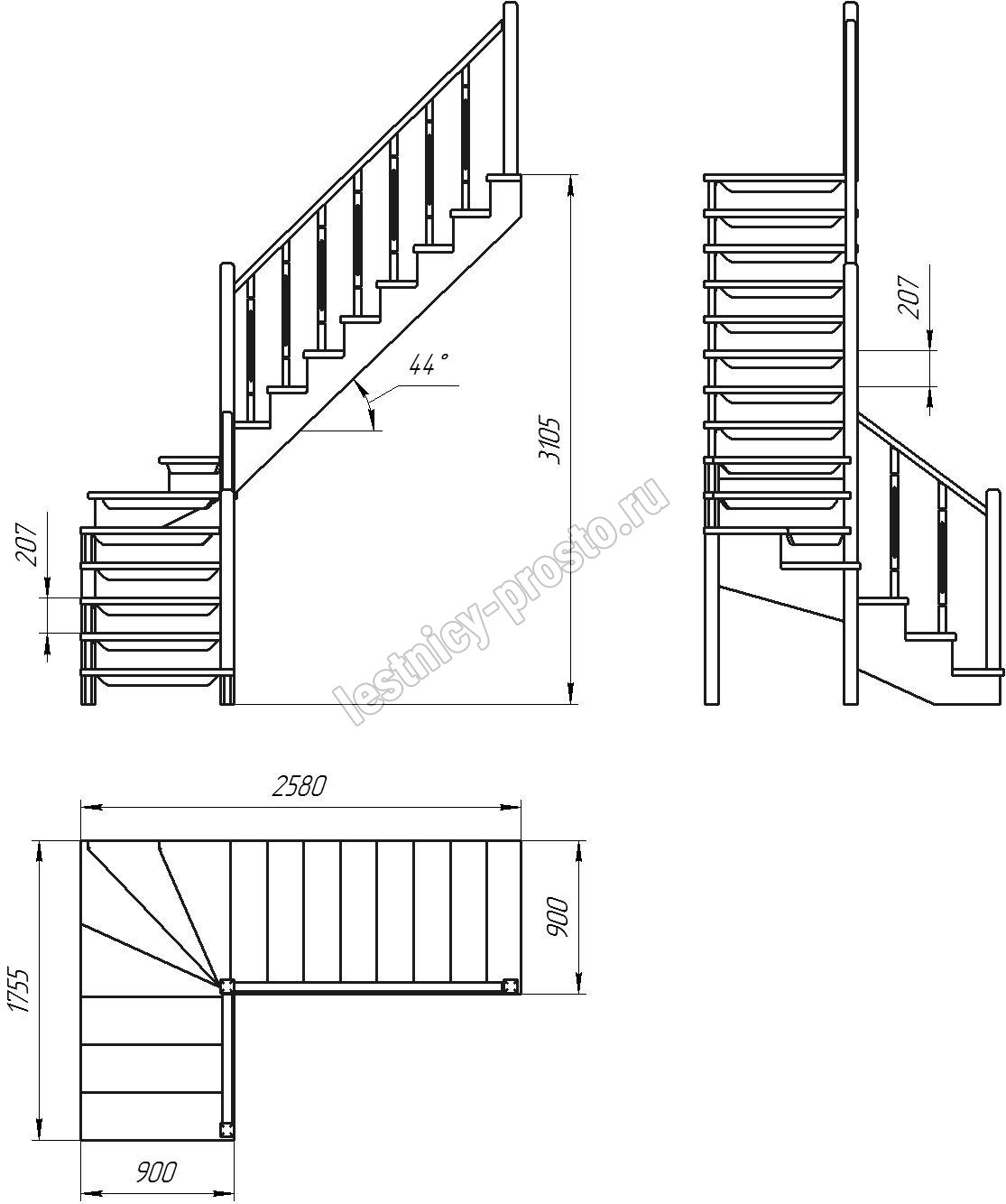 Деревянная межэтажная лестница ЛЕС-09 3105 проем 2580-900, Сосна