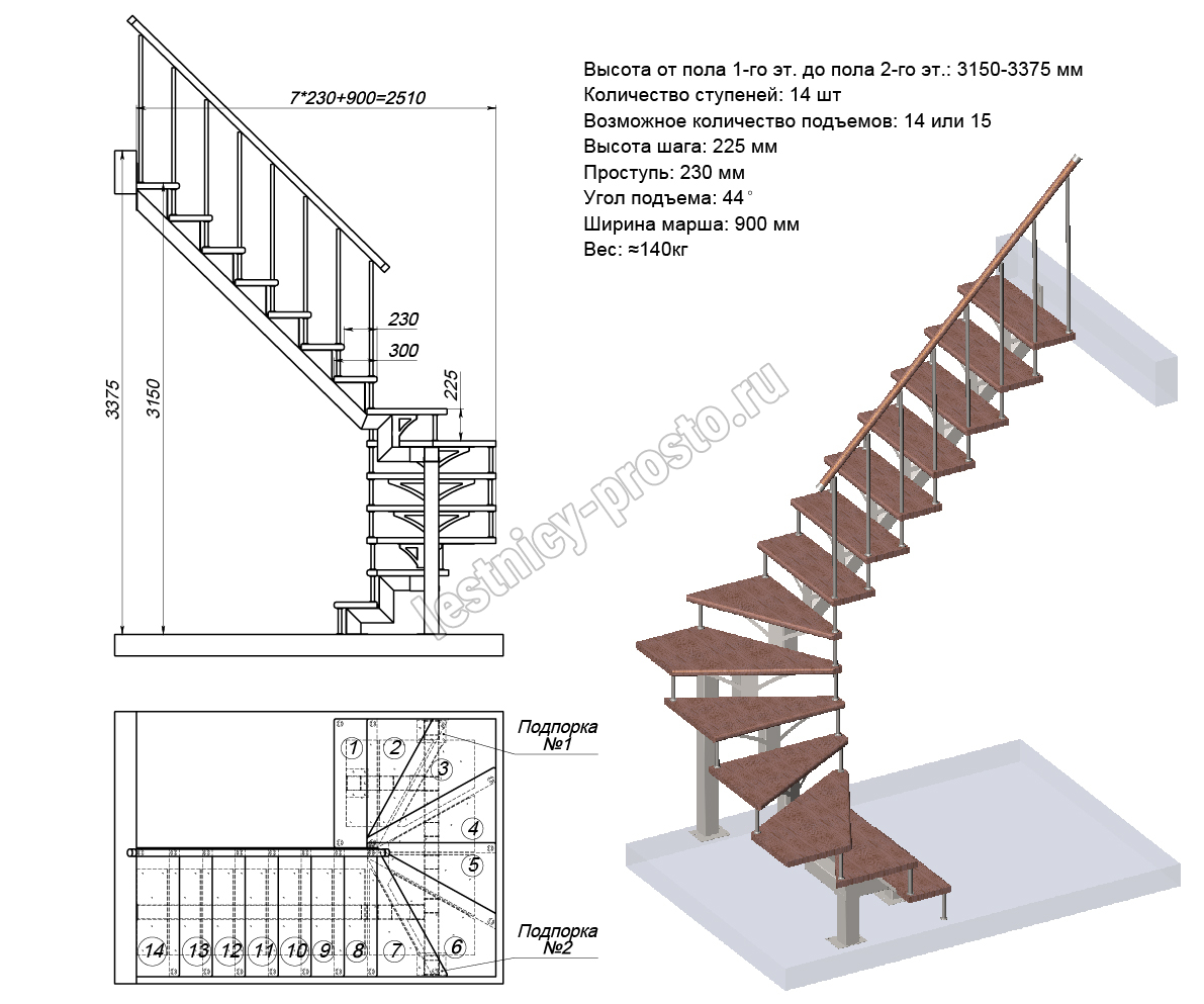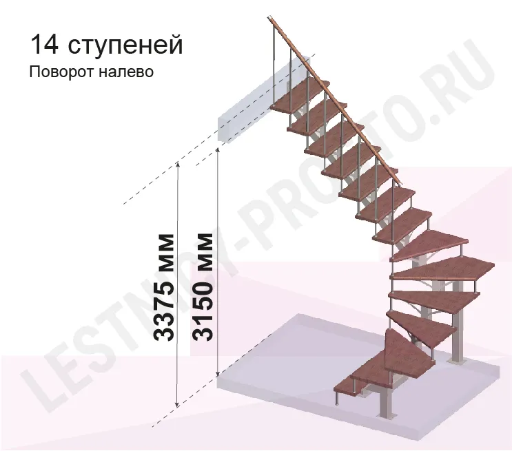 Высота лестницы 3150 - 3375 (14 ступеней) мм