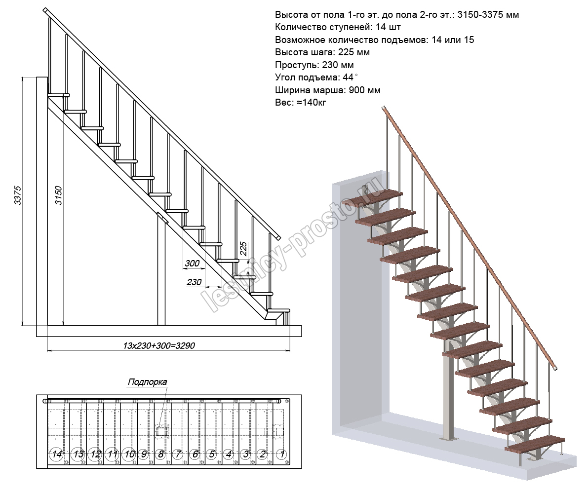 Лестница PROSTO MONO прямая, h337.5 см, ступени бук