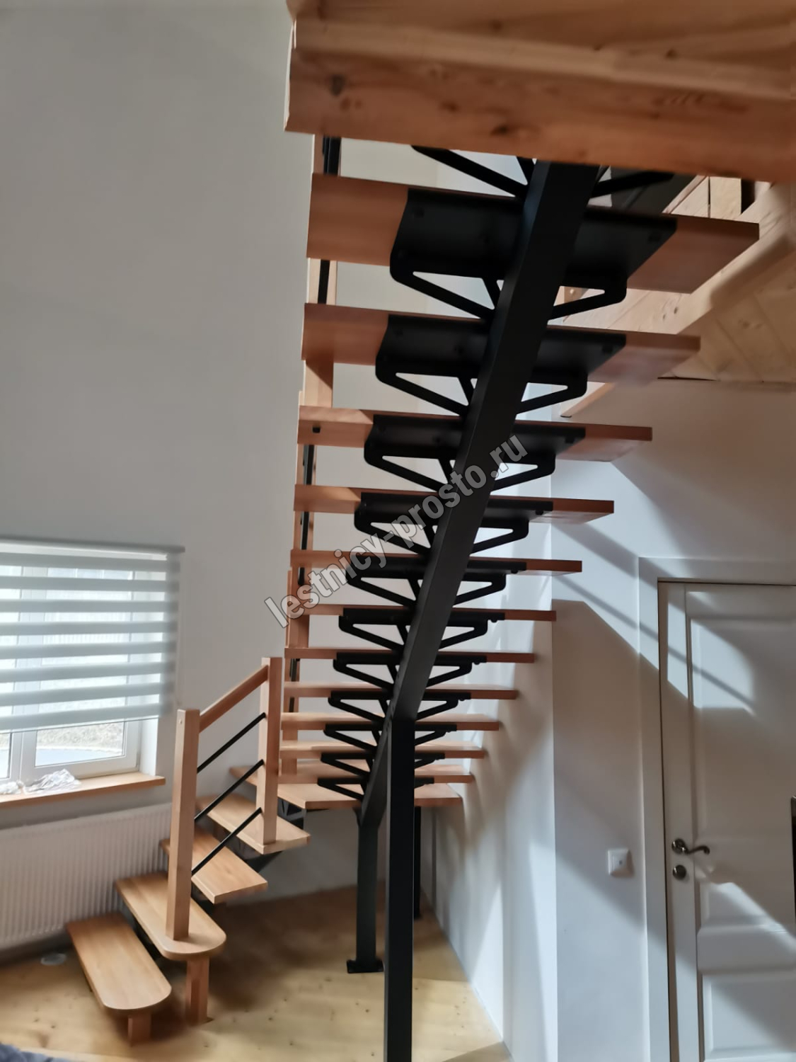 Поворот на 90° реализован посредством площадки, высота поворота определяется параметрами вашего помещения и размерами проёма.