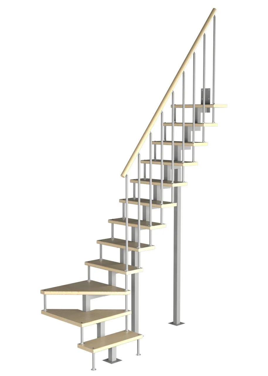 Лестница на стальном модульном каркасе. Высота лестницы регулируется при сборке засчет регулировки высоты шага. Ступени покрыты защитным лаком. Ограждение из стали с пластиковым поручнем. В комплект входят перила с вертикальными стойками и горизонтальными перегородками. Изделие поставляется с шурупами (кроме потолочных и напольных анкеров), инструкциями по монтажу и эксплуатации и гарантией. Внимание! Для этой лестницы необходимо крепление к стене.