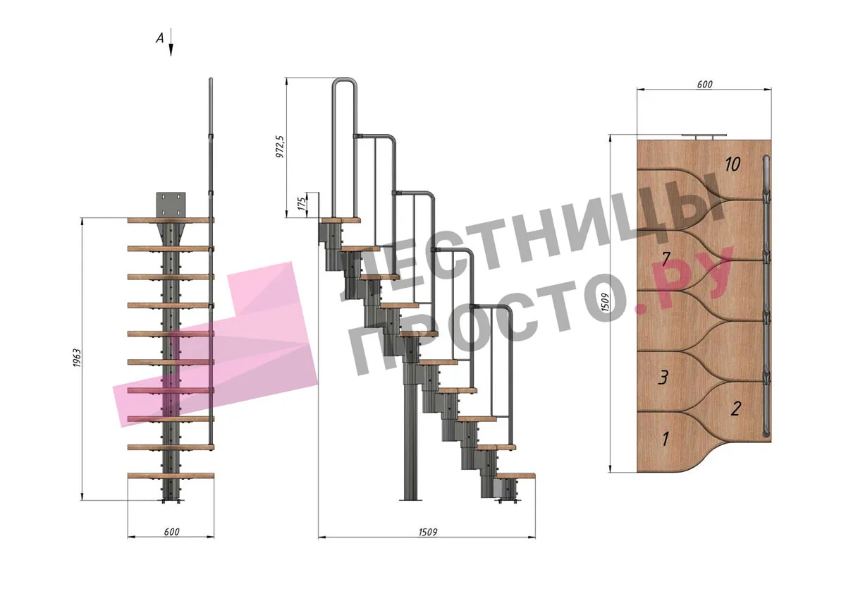 Высота лестницы 1800 - 2640 (10 ступеней) мм