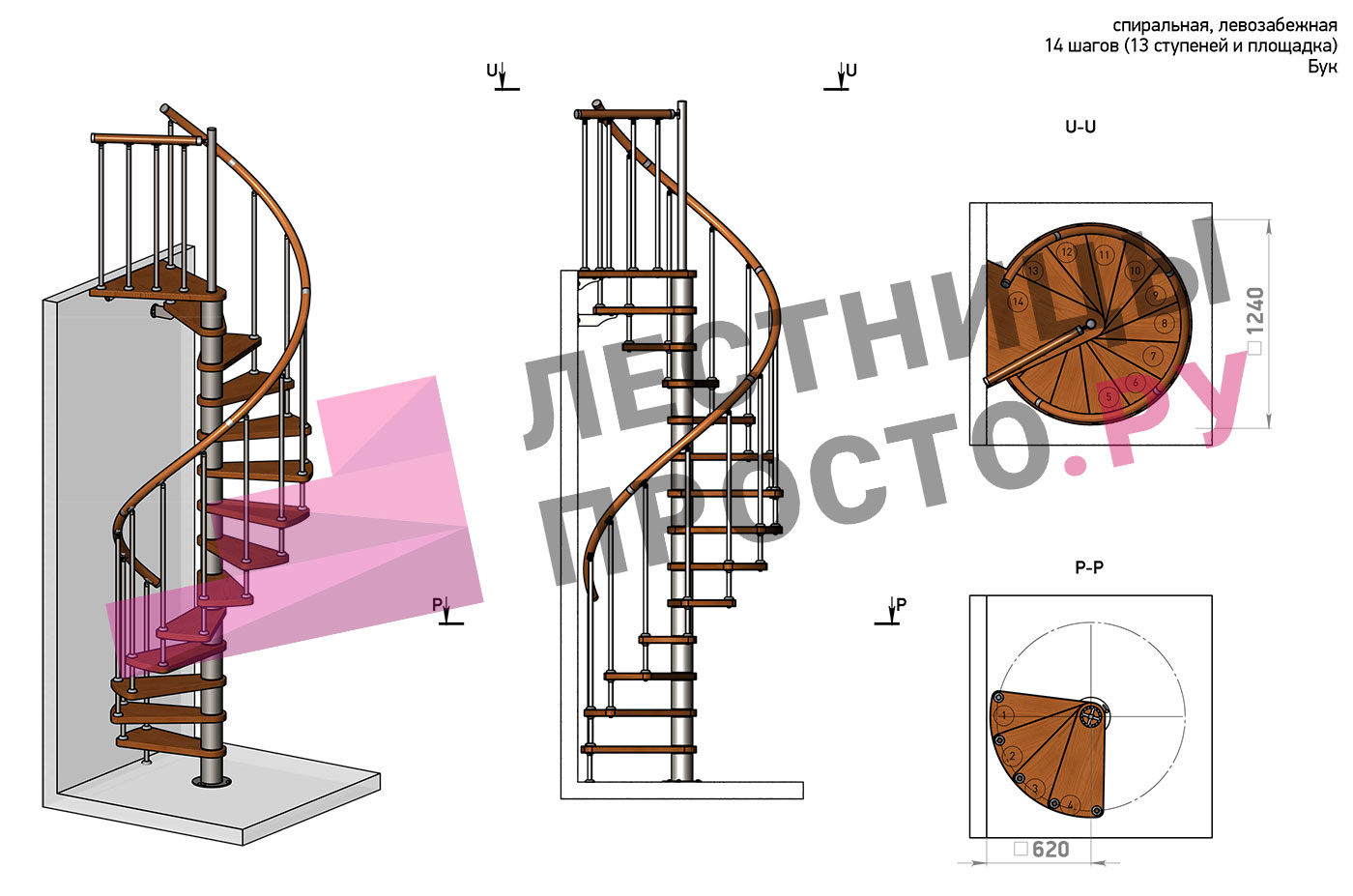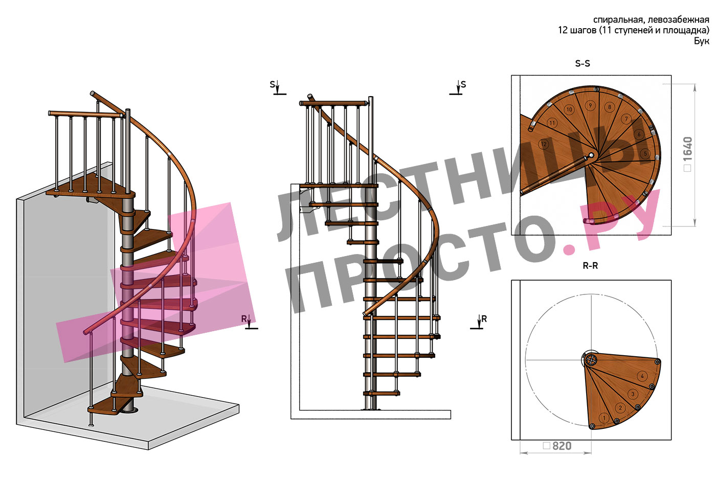 | Винтовая лестница Prosto Spiral Black D140см, h282.2-326,3 см, бук |