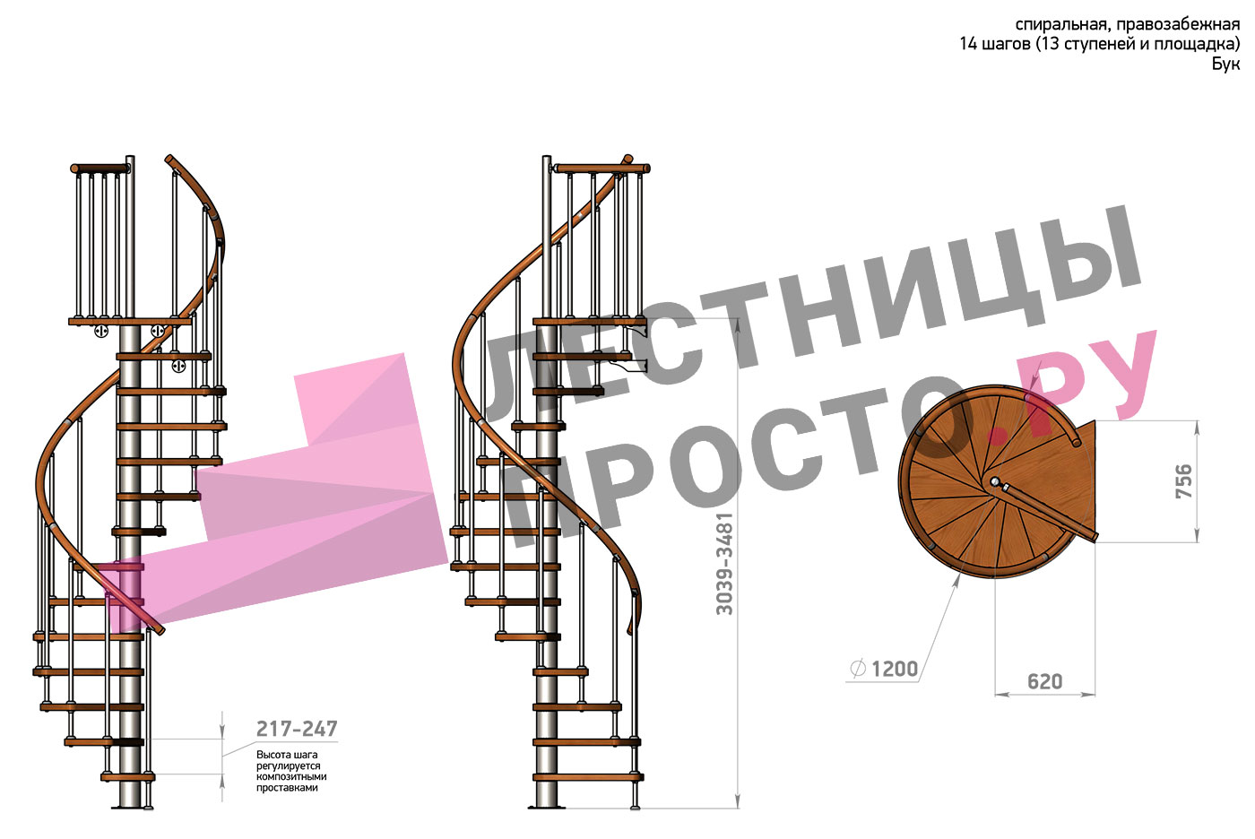 | Винтовая лестница Prosto Spiral Black D120см, h303.9-348,1 см, бук |