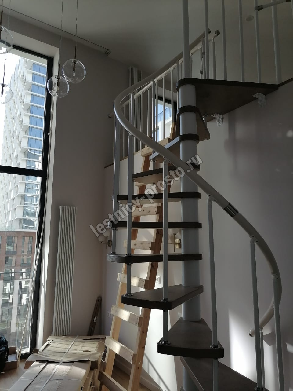 Лаконичная малогабаритная стильная винтовая модульная лестница с белым каркасом.