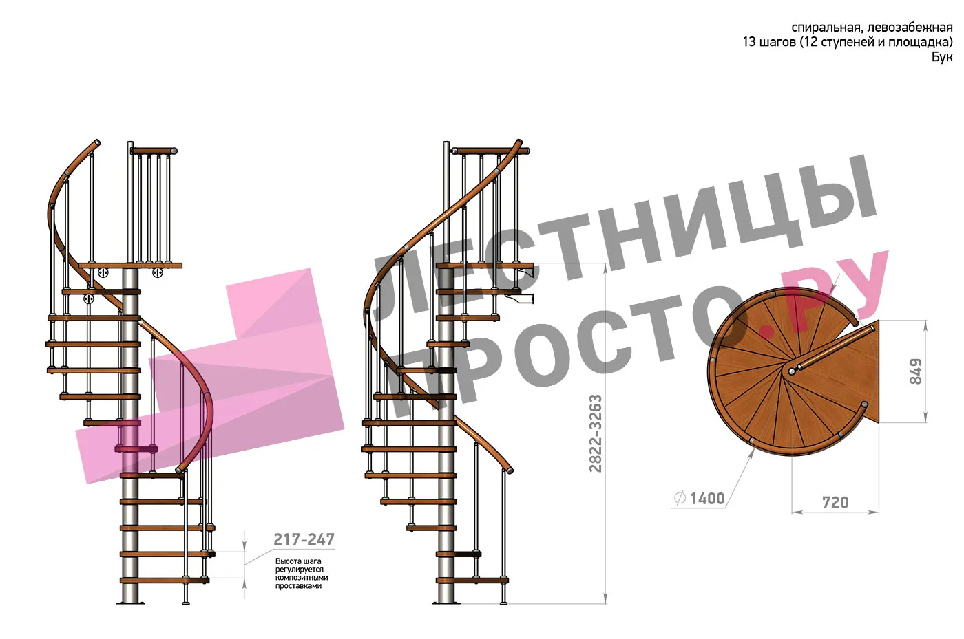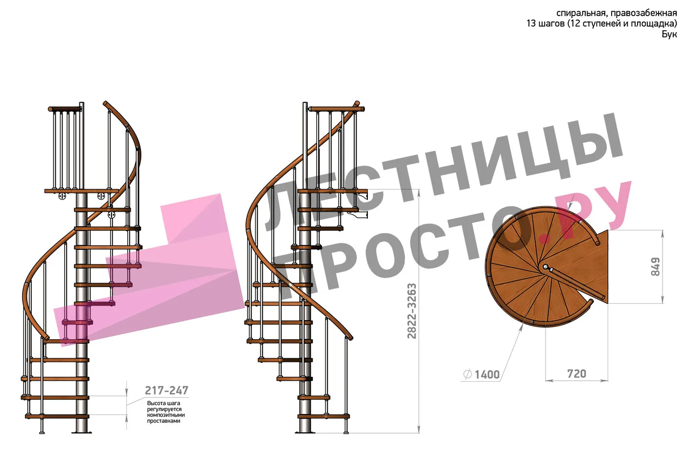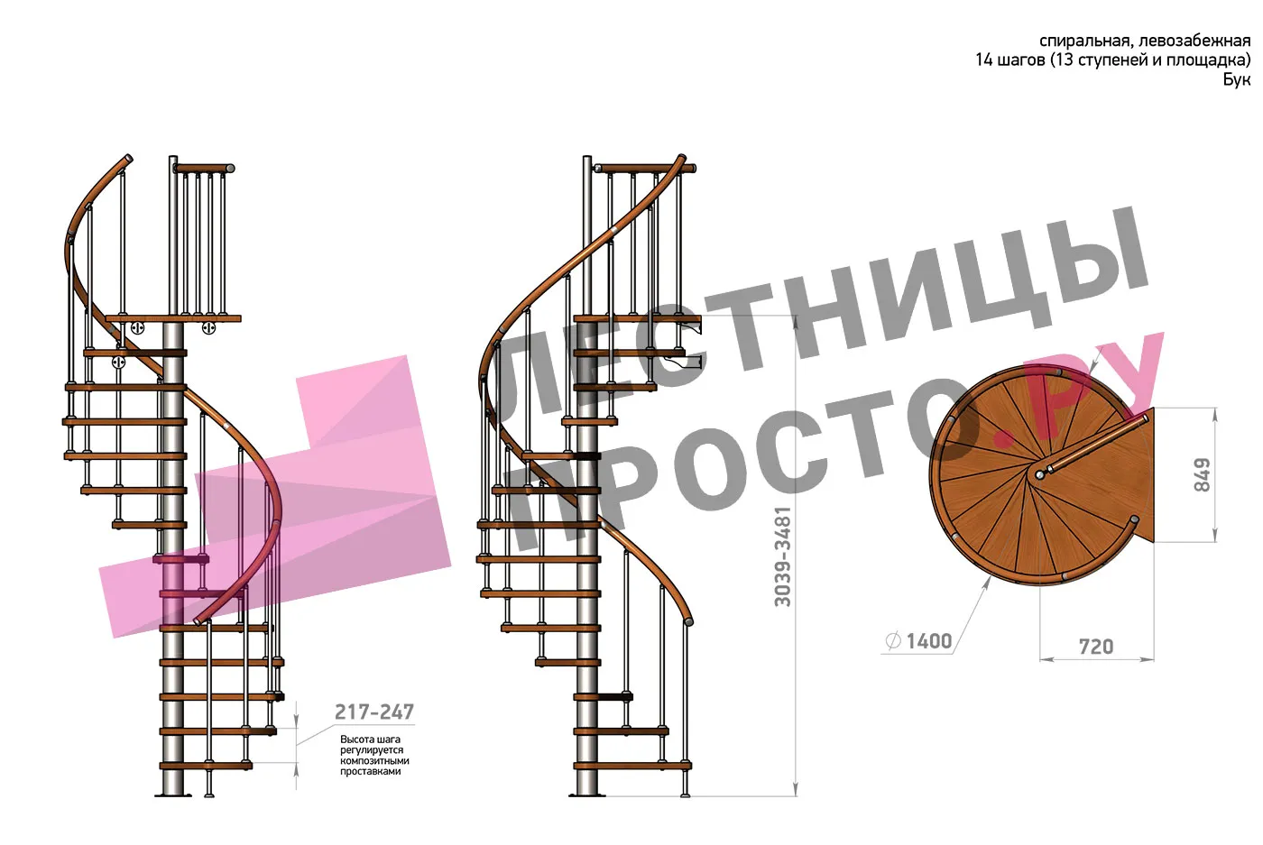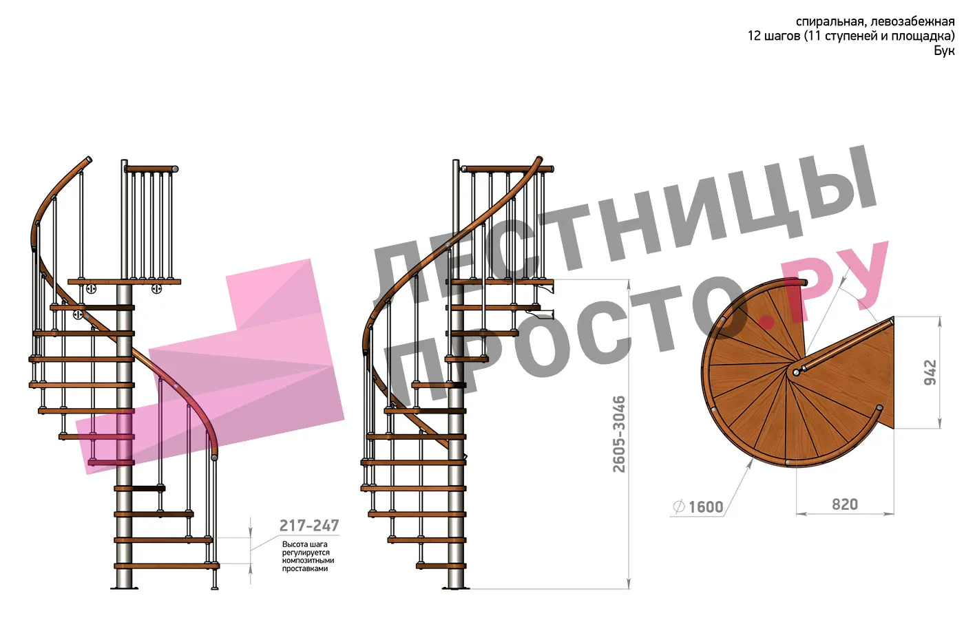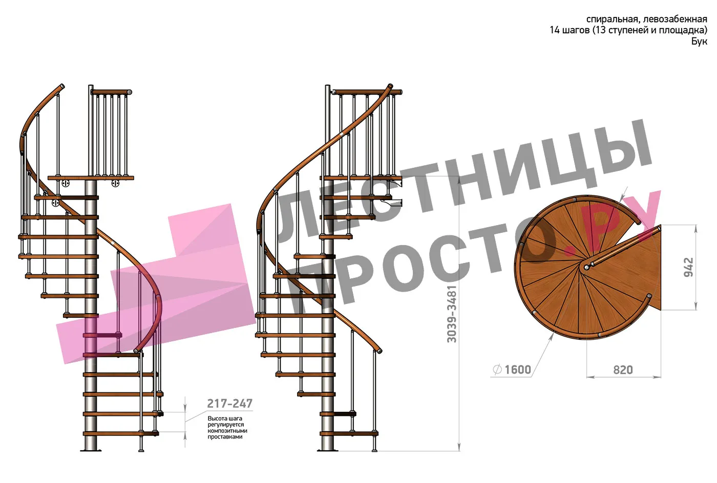 | Винтовая лестница Prosto Spiral White D140см, h260.5-304.6 см, бук |