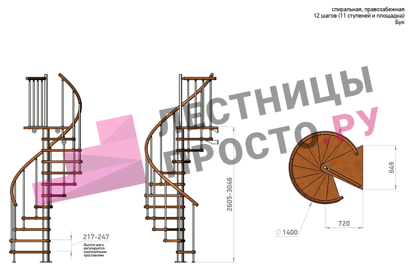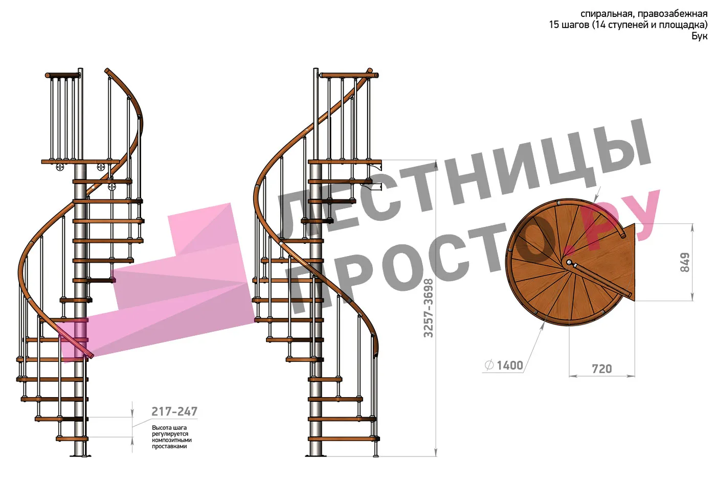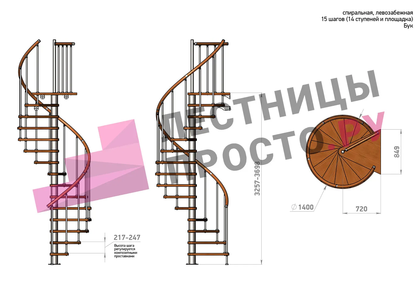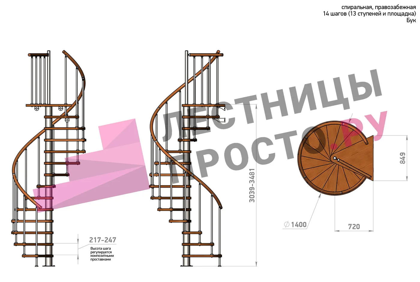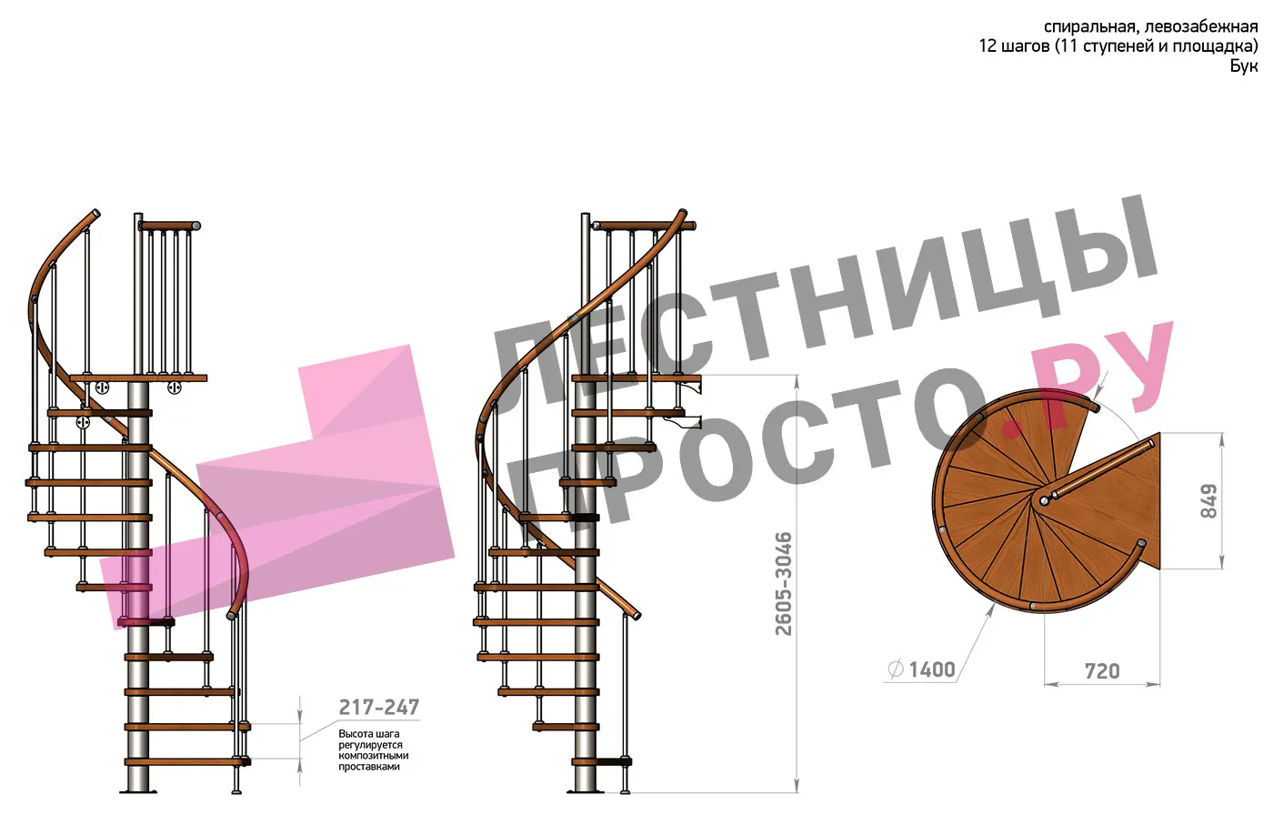 | Винтовая лестница Prosto Spiral White D140см, h260.5-304.6 см, бук |