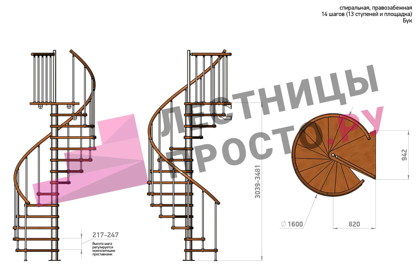 | Винтовая лестница Prosto Spiral White D160см, h260.5-304.6 см, бук |