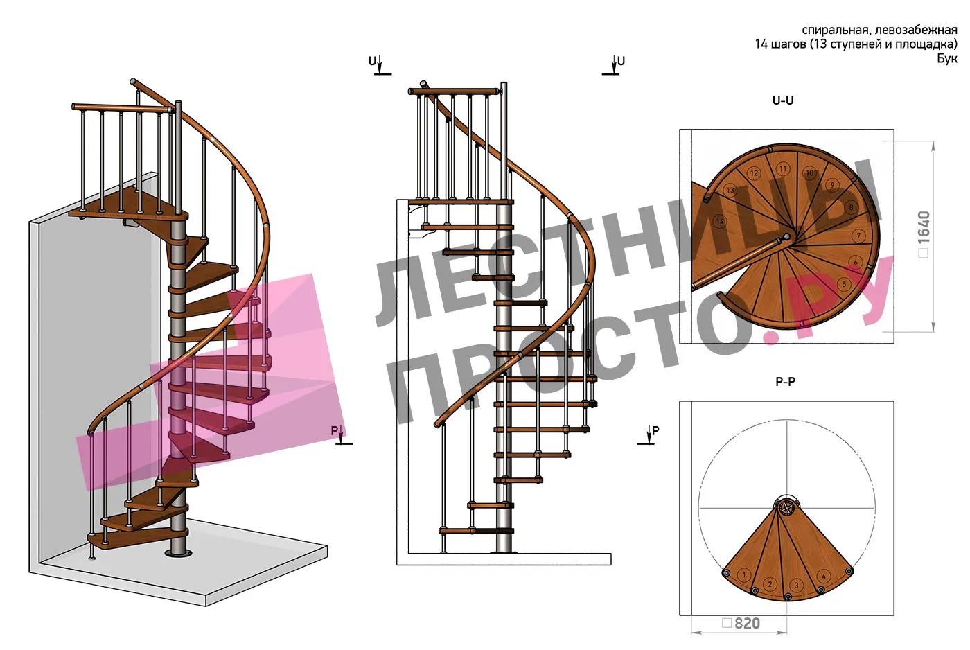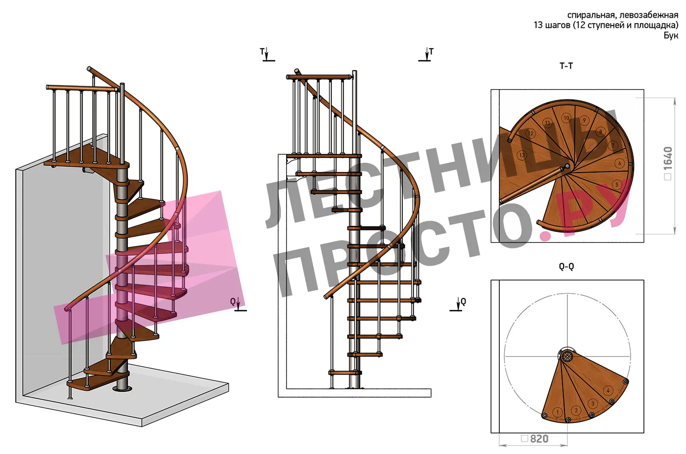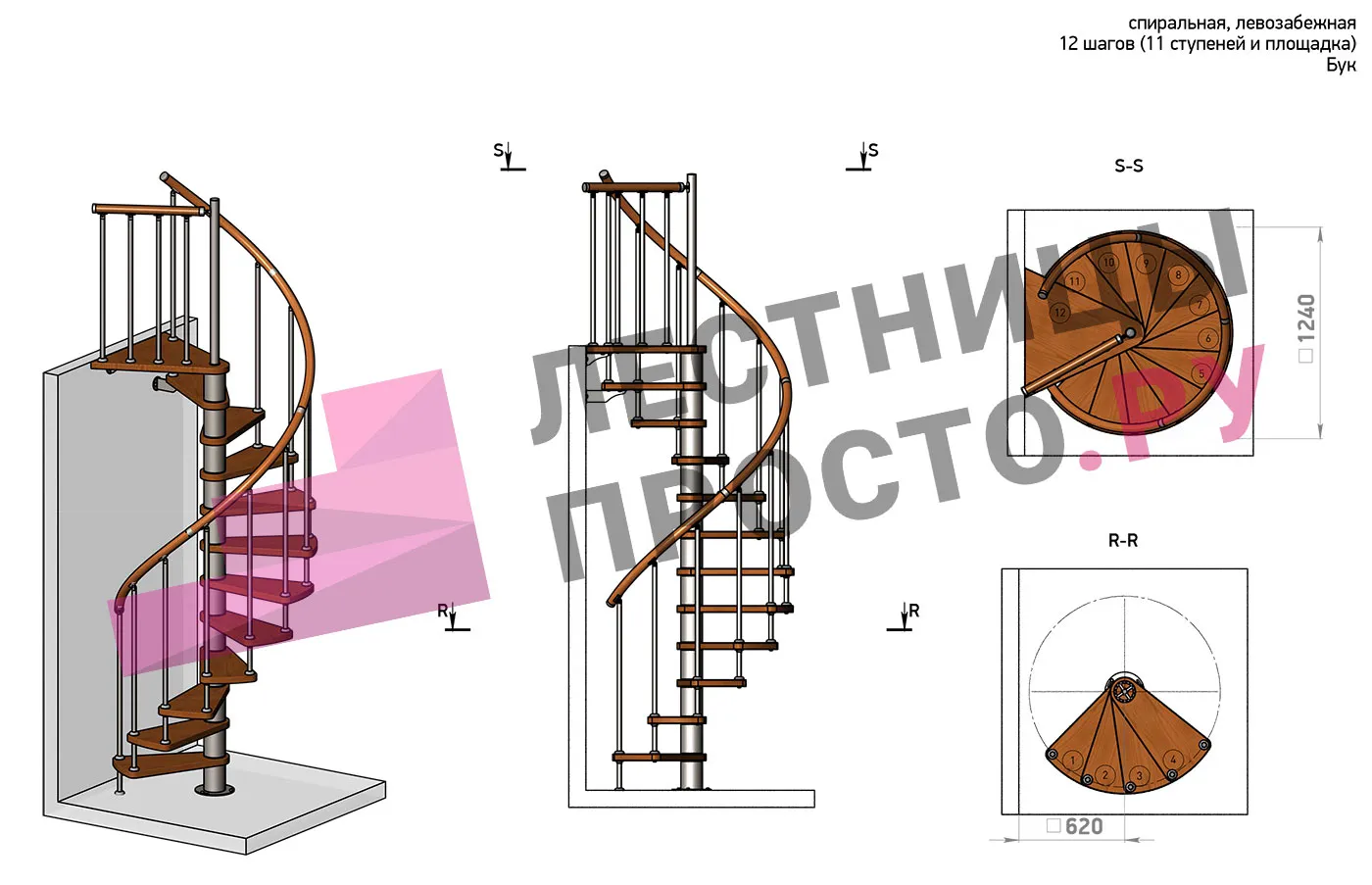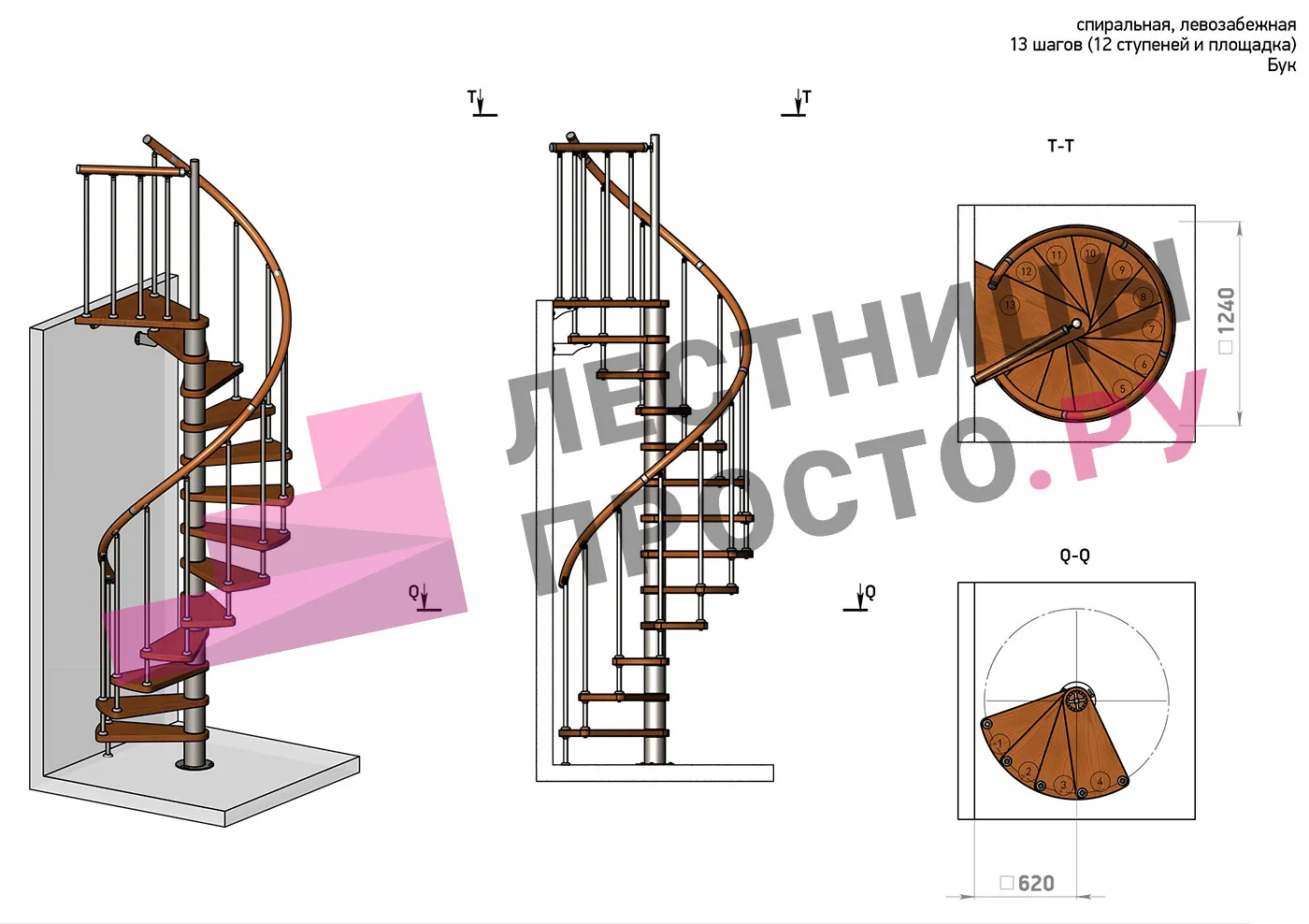 | Винтовая лестница Prosto Spiral White D140см, h325.7-369.8 см, бук |