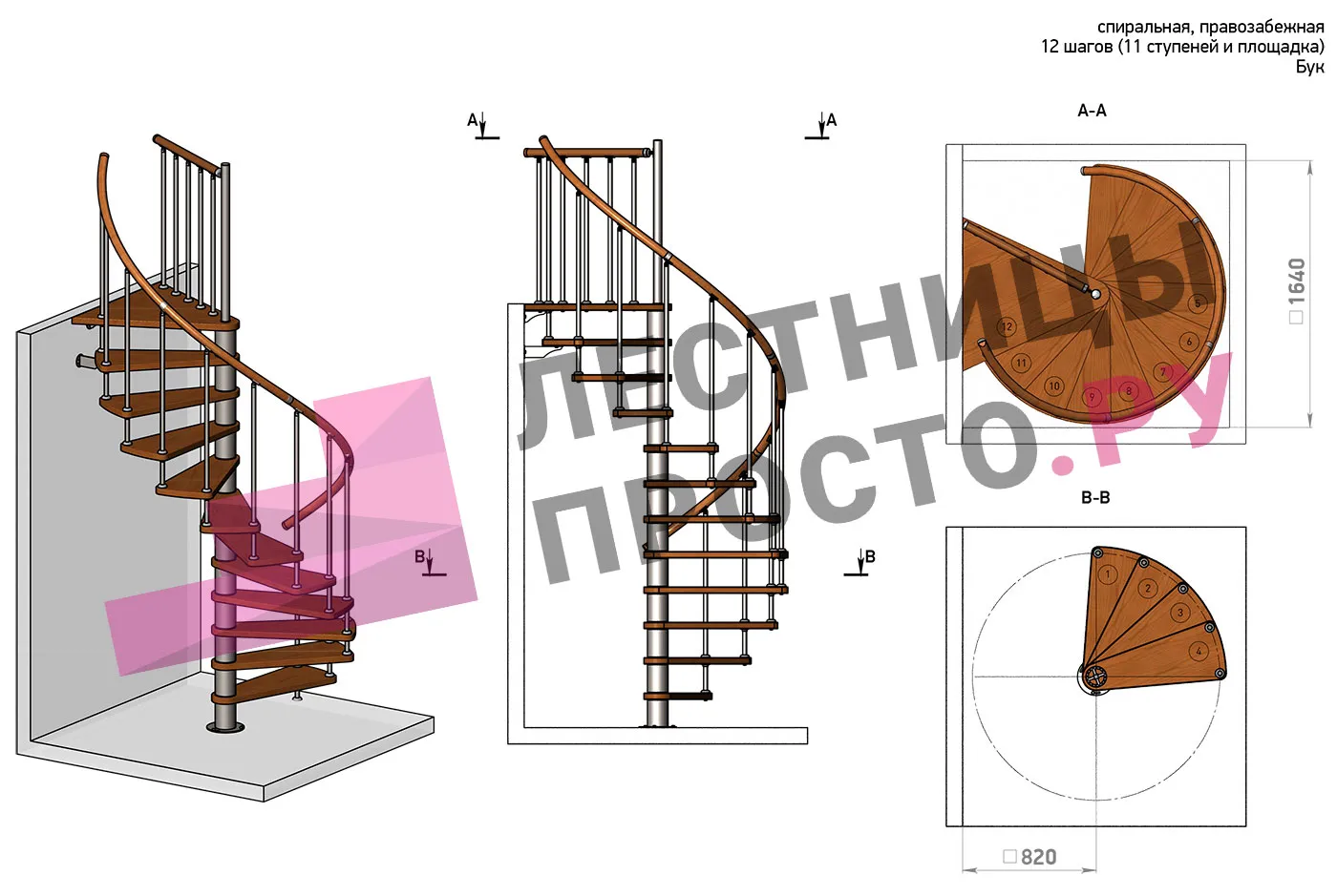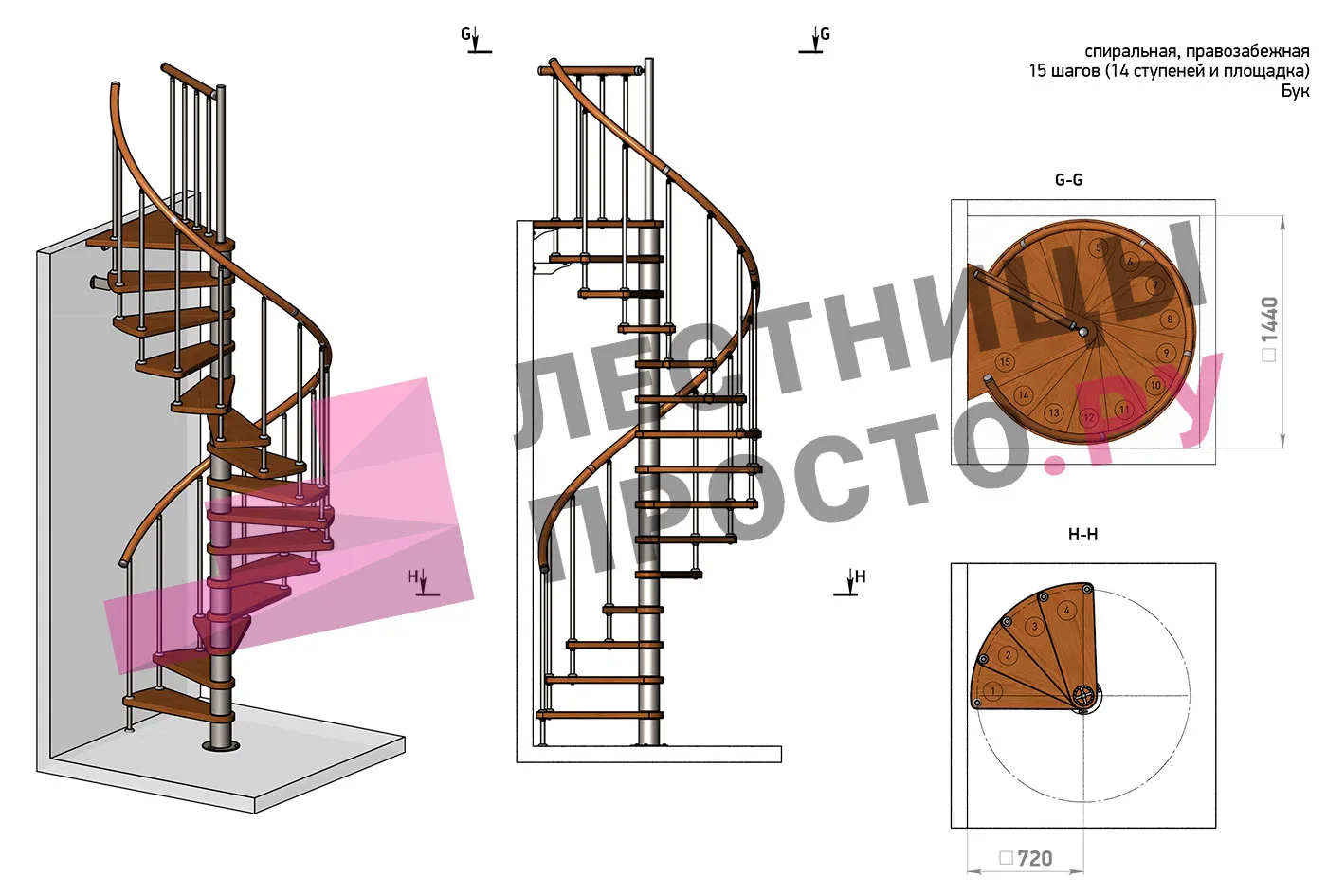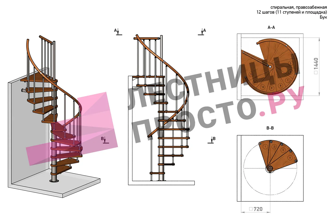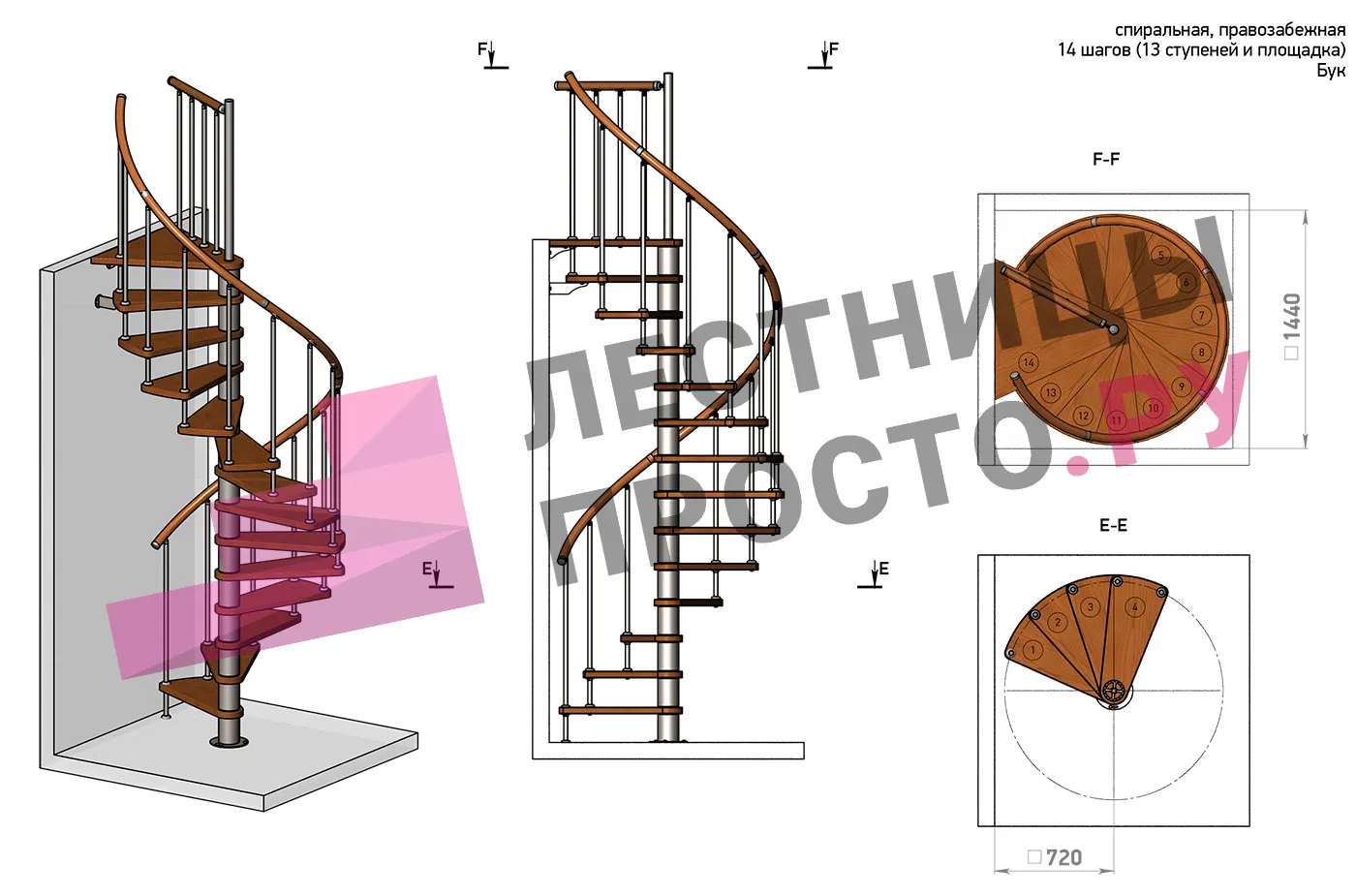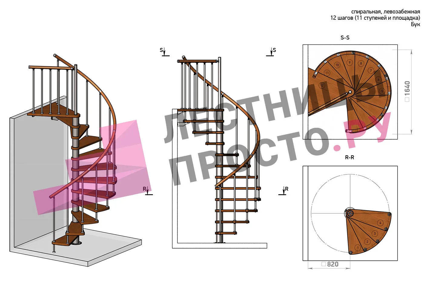 | Винтовая лестница Prosto Spiral White D140см, h325.7-369.8 см, бук |