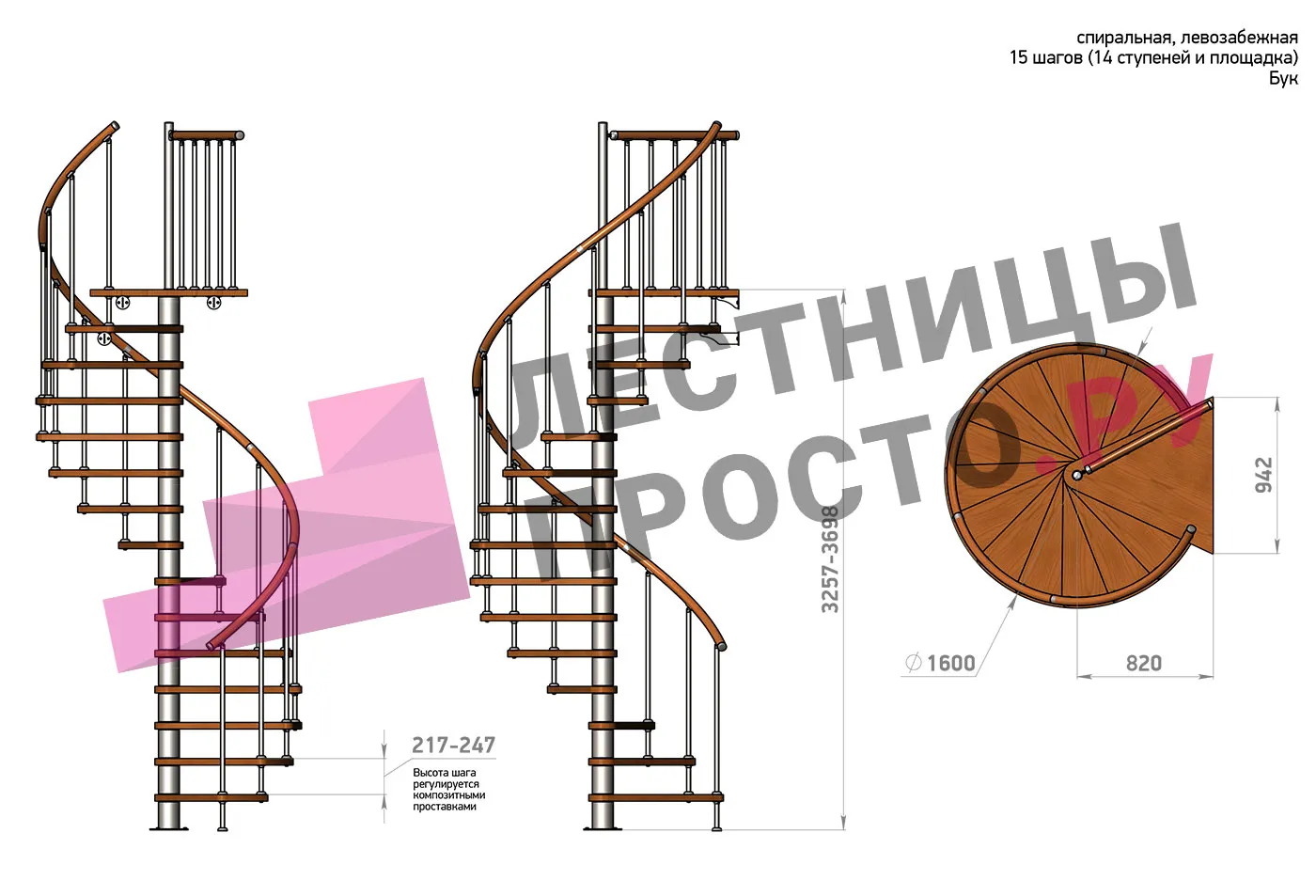 | Винтовая лестница Prosto Spiral White D160см, h325.7-369.8 см, бук |