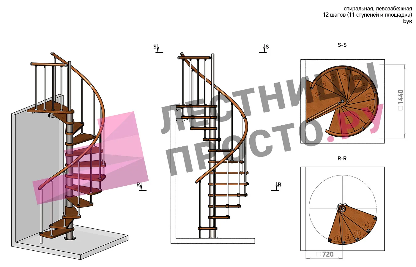 | Винтовая лестница Prosto Spiral White D140см, h282.2-326,3 см, бук |