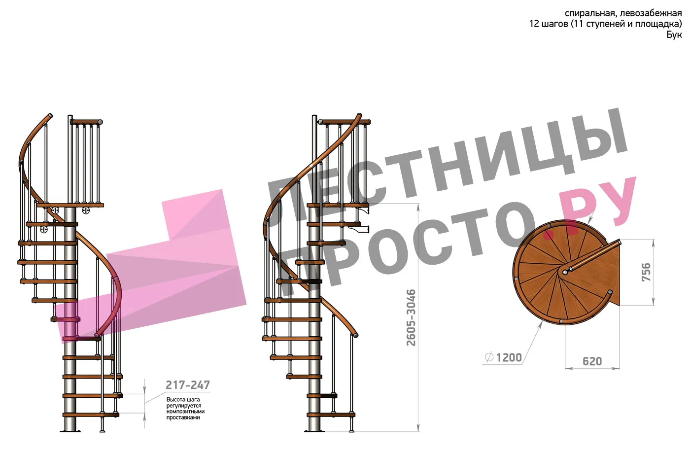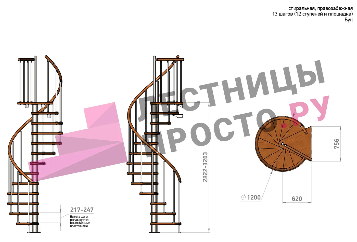 | Винтовая лестница Prosto Spiral White D120см, h260.5-304.6 см, бук |